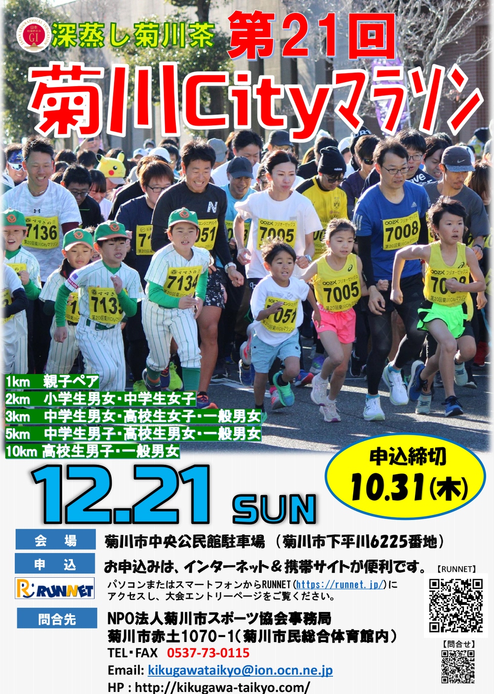 今年で21回目となるマラソン大会。1km、2kmは「おがさセントラルパーク」付近を、3km以上のコースはアップダウンに富んだ、菊川の自然を満喫できるコースとなっています。仮装衣装やユニフォームでの参加も大歓迎!チームや個人で1年の走り納めを参加者の皆さんと一緒に楽しみましょう。