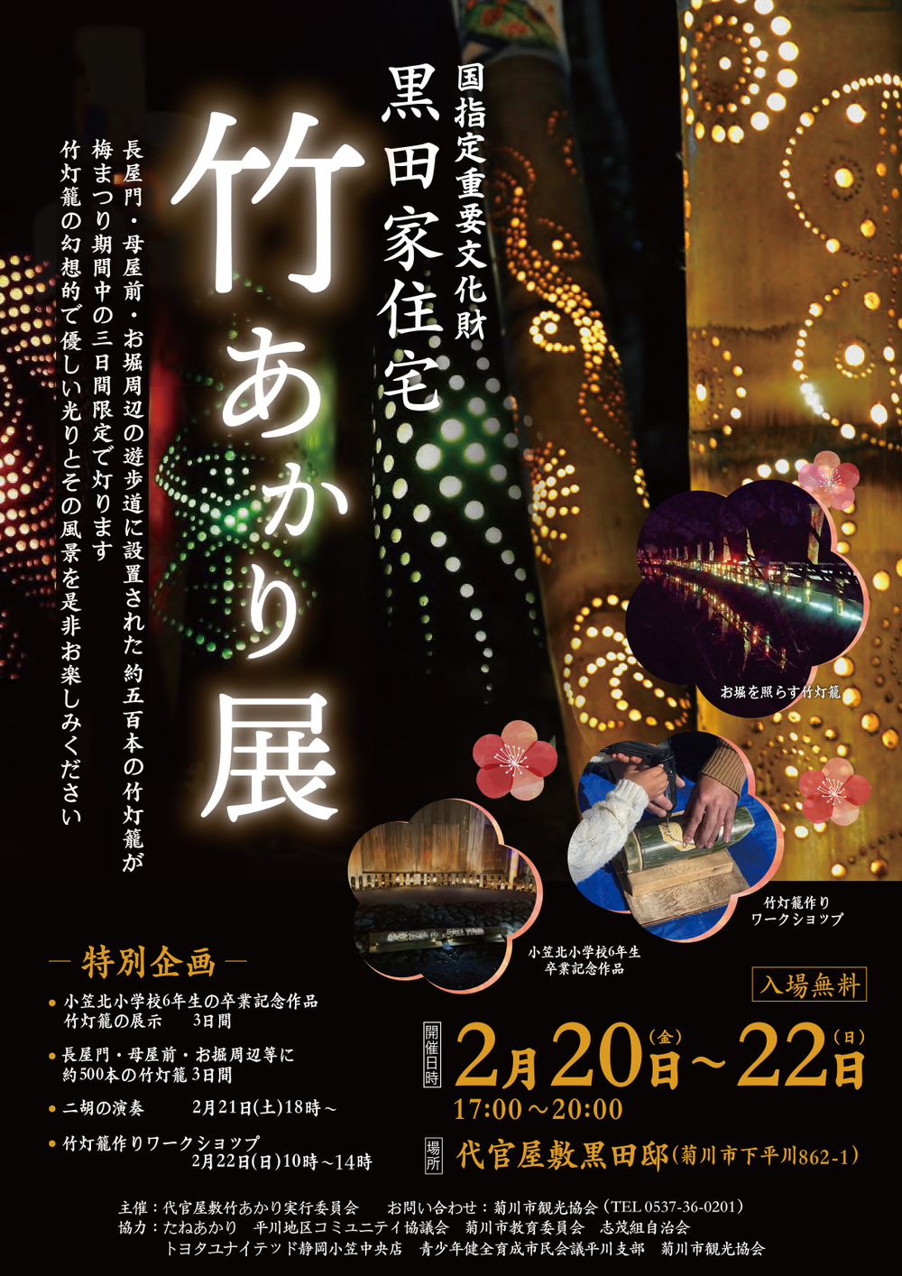 江戸時代から続く格式ある武家「黒田代官屋敷」で行われる梅まつり。お屋敷を見学しながら、その敷地内に咲き誇る11種類140本の梅を無料鑑賞することができます。2月20日(金)~22日(日)は夜に「竹あかり展」も開催。ぜひこの機会に足を運んでみてはいかがでしょうか。