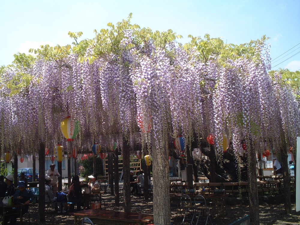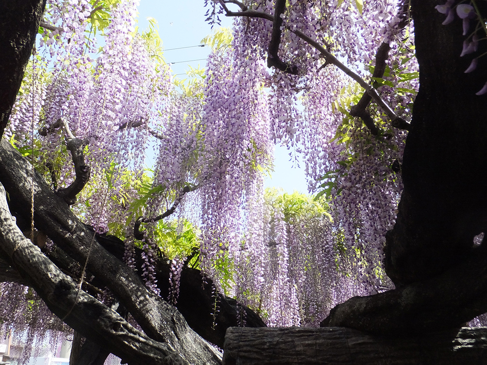 磐田市「行興寺」の「熊野(ゆや)の長藤」の一枝を東光寺が譲り受け、育てられた長藤です。市の天然記念物に指定されている長藤は、20m四方の藤棚から薄紫色の花が1メートル以上も咲き誇ります。100年以上かけ、今では根回りが4メートルある立派な長藤となっています。