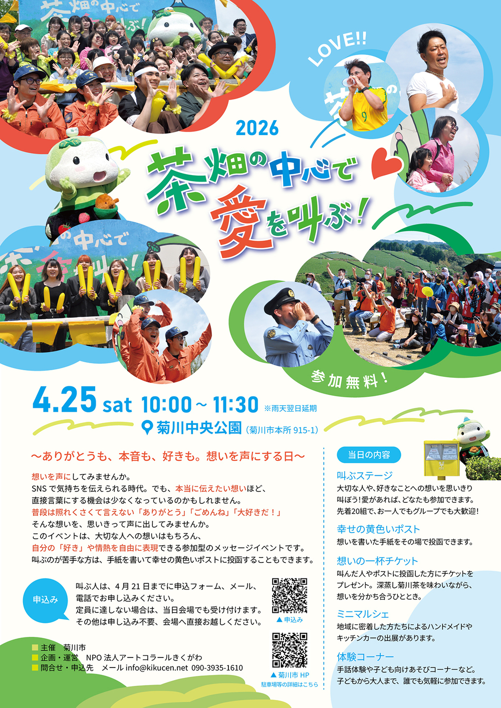 普段は照れくさくて言えない「ありがとう」「ごめんね」「大好きだ!」そんな想いを、萌黄色の茶畑に向かって思いきって声に出してみませんか。このイベントは、大切な人への想いはもちろん、自分の「好き」や情熱を自由に表現できる参加型のメッセージイベントです。叫ぶのが苦手な方は、手紙を書いて幸せの黄色いポストに投函することもできます。只今、愛を叫びたい人、募集中!
