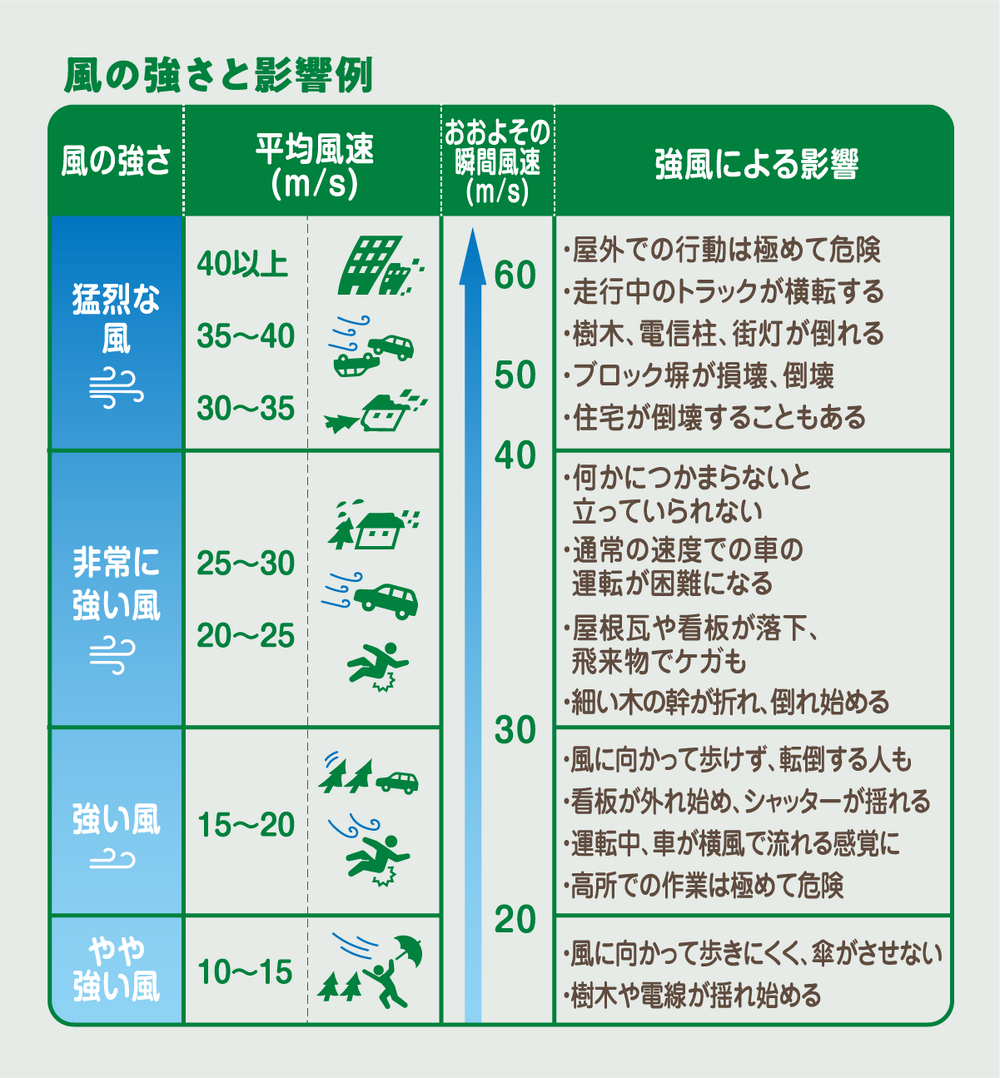 風速10m/sとは、吹いている風の10分間の平均値が毎秒10mの速さであることを表しています。風速10m/s〜15m/sは「やや強い風」とされています。