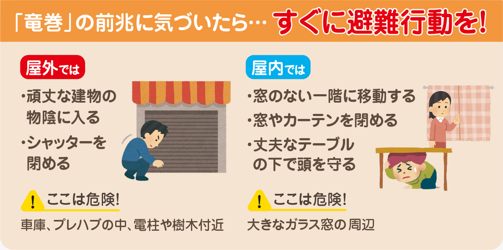 竜巻発生の前には、低く黒い雲が近づいて暗くなる、雷鳴や雷が見える、急に冷たい風が吹く、強い雨や風が窓に打ち付ける、大粒の雨やひょうが降るといった兆しがみられます。