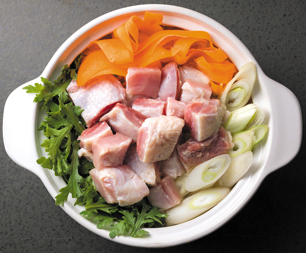 しゃも肉を4〜5cm四方に切る。長ねぎは斜め切り、にんじんはピーラーでリボン状に、春菊と豆腐は食べやすい大きさに切る。