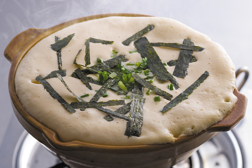 2の土鍋の火を強くして軽く煮立てたら、火を弱火に戻し、3の泡だてた卵を表面を覆うように流し込む。フタに卵がつかないよう注意しながらフタをしたら、火を止めて2〜3分蒸らし、刻んだネギと海苔をのせればできあがり。お好みで七味を振っていただく。