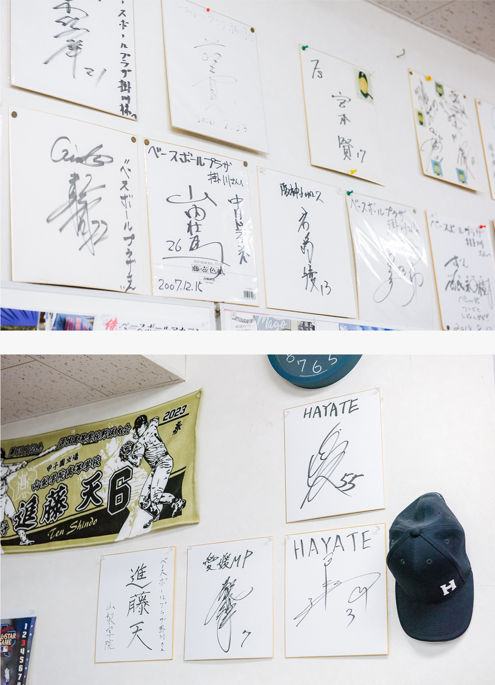 - 20年の歴史があるということで、施設のいたるところにはプロ野球選手のサインなどがずらり。中には2023年春の甲子園でチームを優勝に導いた「山梨学院高校」のキャプテン、進藤天選手のサインも。進藤さんは小さい頃からこの「ベースボールプラザ掛川」で練習をしていたということで、このスターに続けと、多くの野球好きが通います。