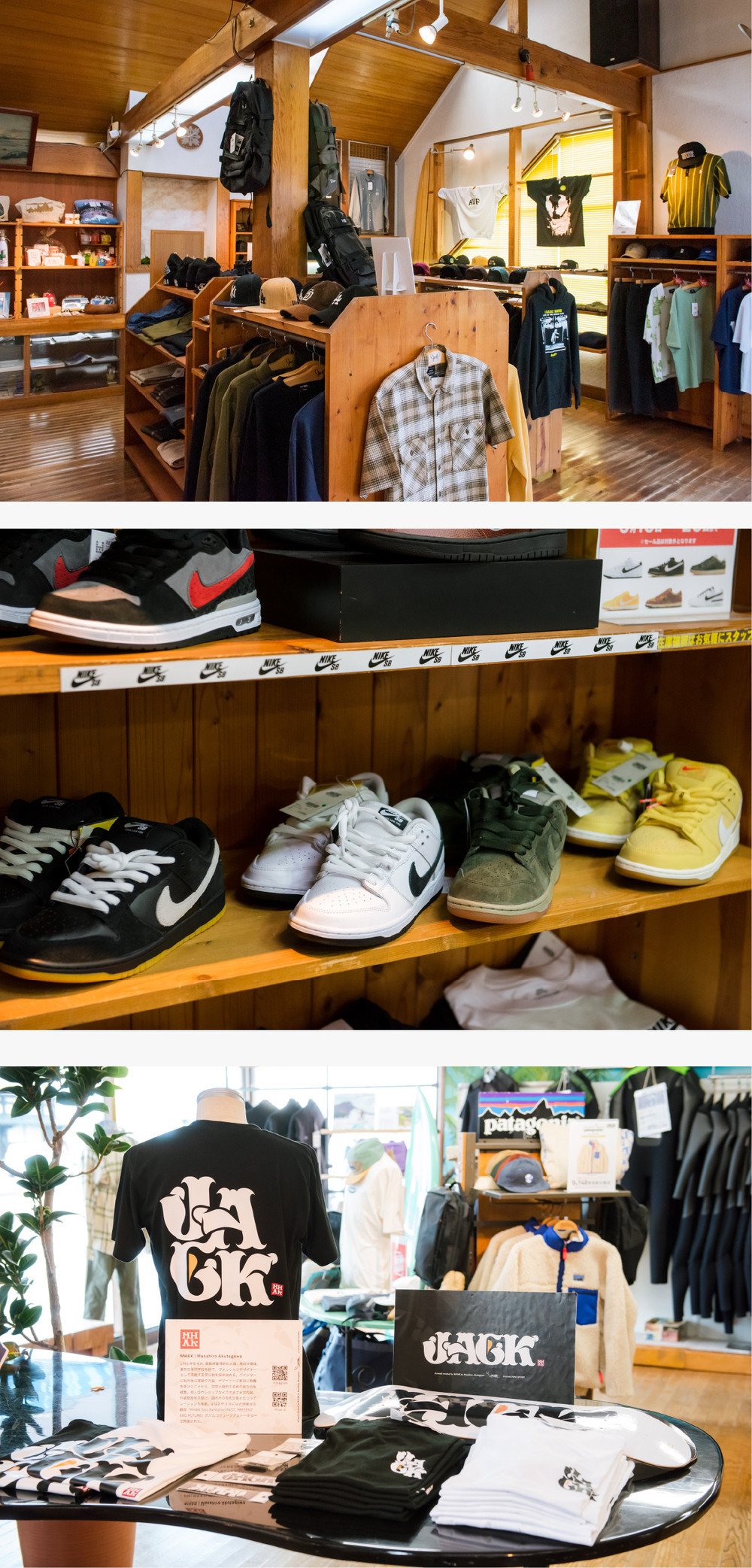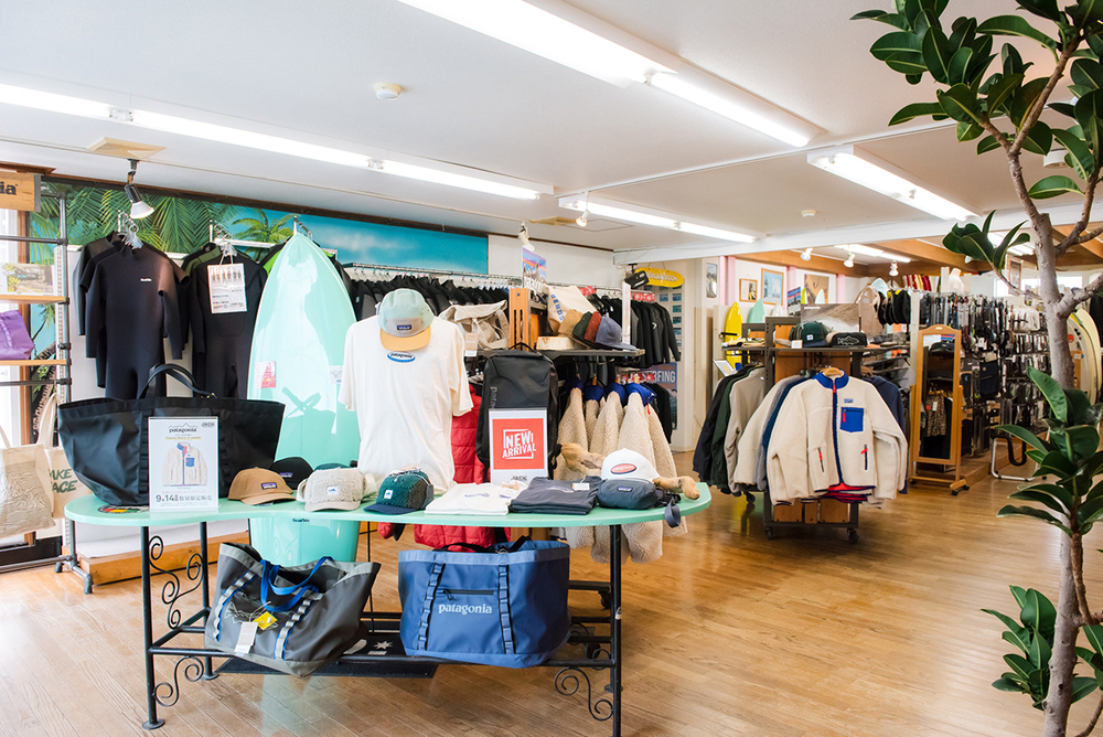 現在ショップの売り場はアパレル・スポーツグッズで半々ほど。ショップエリアは定番をはじめ何十ものブランドやアイテムが季節ごとにセレクトされており、感度の高いファンが長年通います。場所柄、海水浴やツーリングを楽しんだ方が立ち寄ったり、サーフィンついでに著名人がお忍びでショッピングを楽しんだりということも。