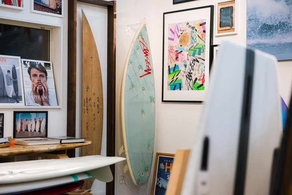 - また、この「JACK OCEAN SPORTS」の歴史を語るうえで欠かせないのが「STUSSY」。世界中で愛されているアパレルブランドですが、創設者ショーン・ステューシー氏は自身もサーファーであり、サーフボードをシェープしていた人物。ブランドの人気に火が付く前後では、なんと相良でサーフボードを削っていたとのこと。当時使用していたという貴重な品々が残っており、いかにこの「JACK OCEAN SPORTS」が静波のサーフィン文化に大きく影響を与えていたかが垣間見えます。