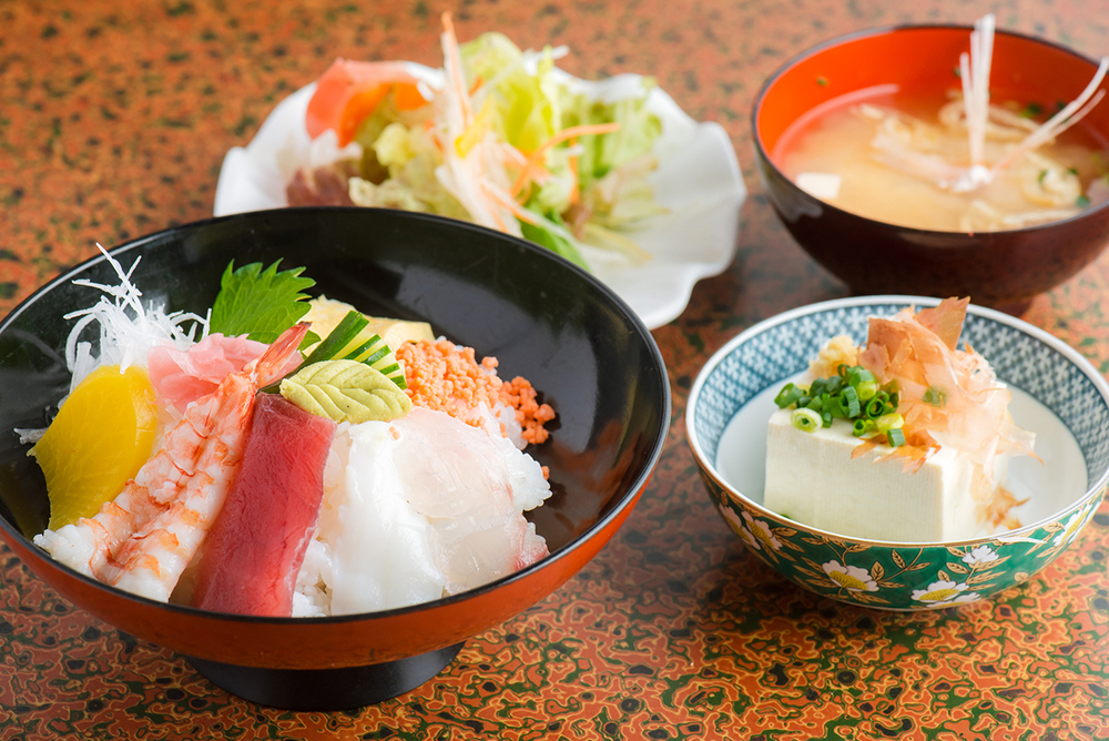 - <ランチ限定>海鮮丼 660円(みそ汁・サラダ・冷奴はオプション 各110円)