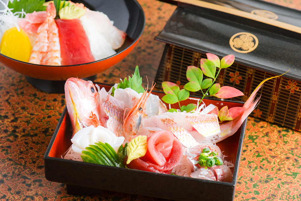 昼・夜ともにオーダーできる「大名刺身御膳」は、大名駕籠(かご)に見立てた器が目を引くスペシャルなセット。刺身や時季によって種類が異なりますが、必ず尾頭付きで提供するという豪華さ。まぐろやイカ、甘エビ、白身、光り物と、地物や海鮮の魅力を余すことなく味わえます。