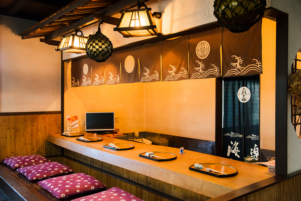 - 「海楽(かいらく)」は東名高速道路 菊川ICから車で約15分、御前崎市との市境にほど近い食事処。もともとは江戸前寿司のお店として相良で創業し、40年ほど前にこの地へ。以来、新鮮な魚介類を味わえたり、昼から呑めたりするお店が限られているこのエリアで、貴重な集いの場として愛されています。店内に入ると一際目を引くのは、ひのきでできた一枚板のカウンター。店主こだわりの特等席だそうで、目の前で魚を捌く姿を見ながら食事をすることができます。