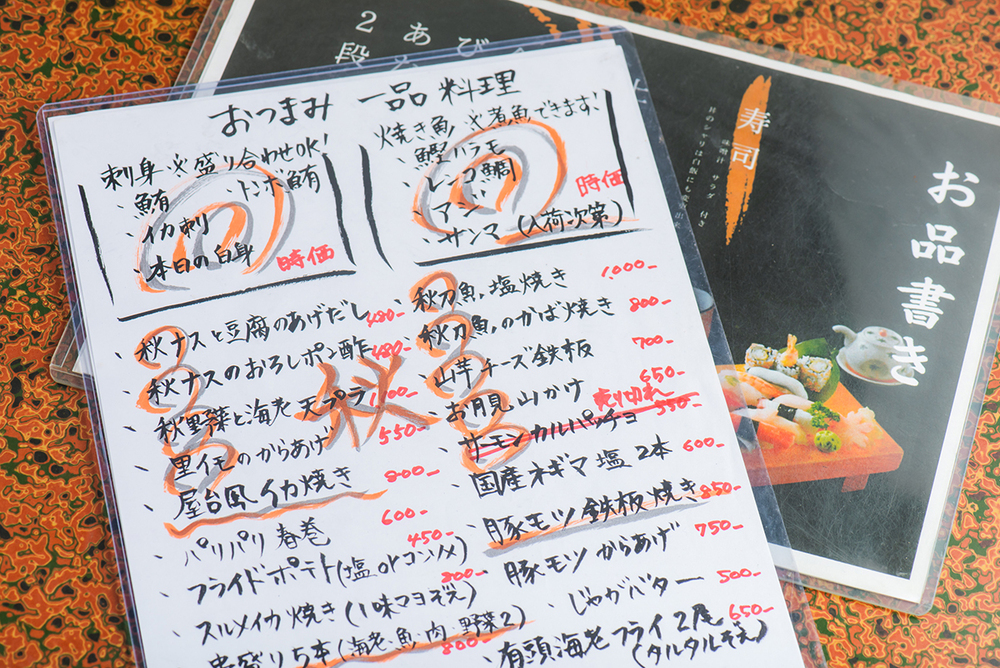 - 夜は寿司や丼といったご飯物に加え、おつまみや一品料理が加わります。旬の魚や野菜を使った料理はどれもお酒に合うものばかり。中には40年以上通うお酒好きの常連さんもいるんだとか。もちろん昼飲みもOK。席はカウンターの他にもテーブルや個室もあり、気の置けない仲間との飲み会や宴会にもぴったりです。