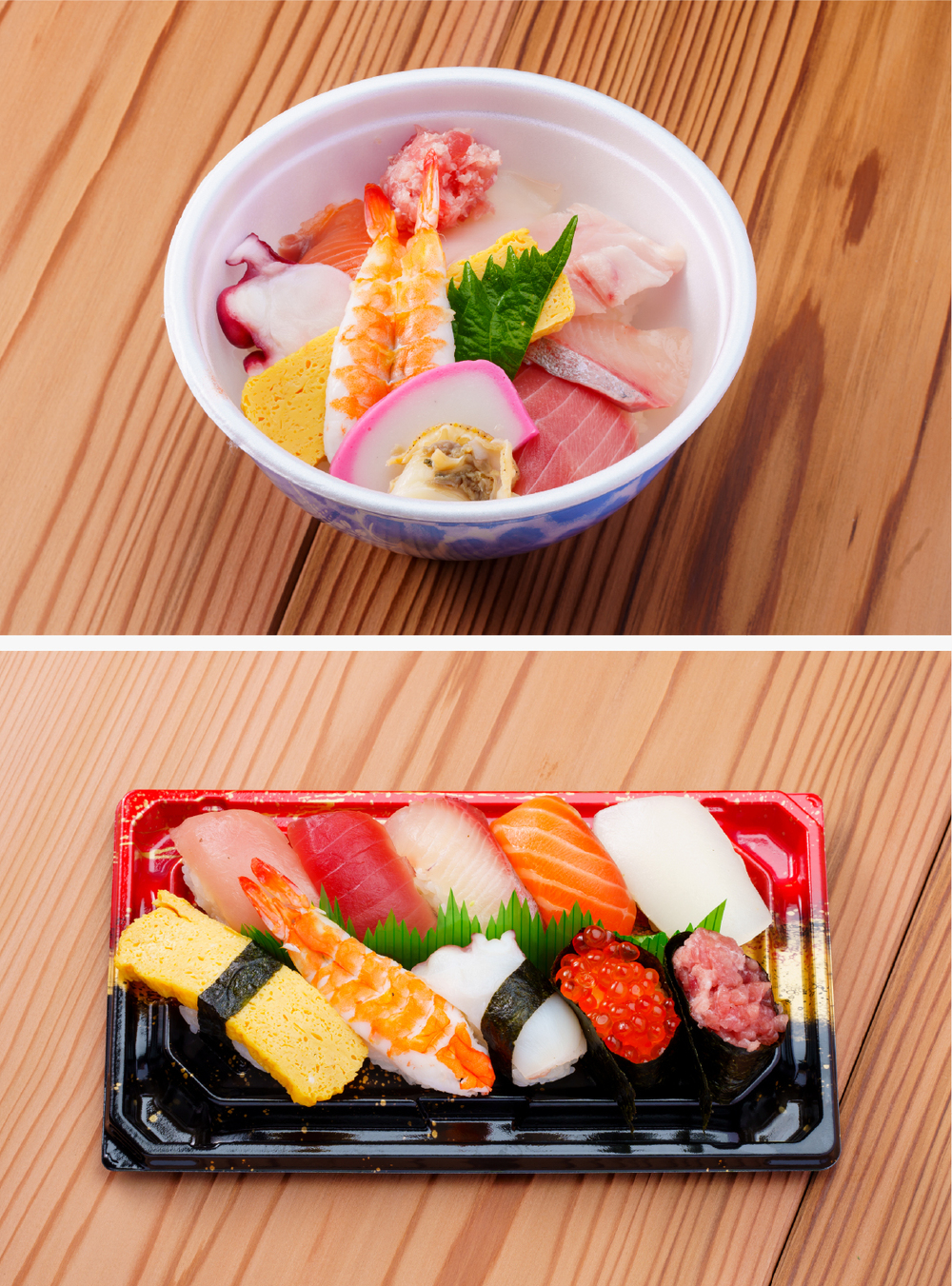- その他、鮮魚市場では寿司や丼物のテイクアウトも可能。桶盛りもできますので、誕生日やお祝いごとのシーンでも大活躍。当日の注文もできますが、内容や量によっては事前予約の方がスムーズです。