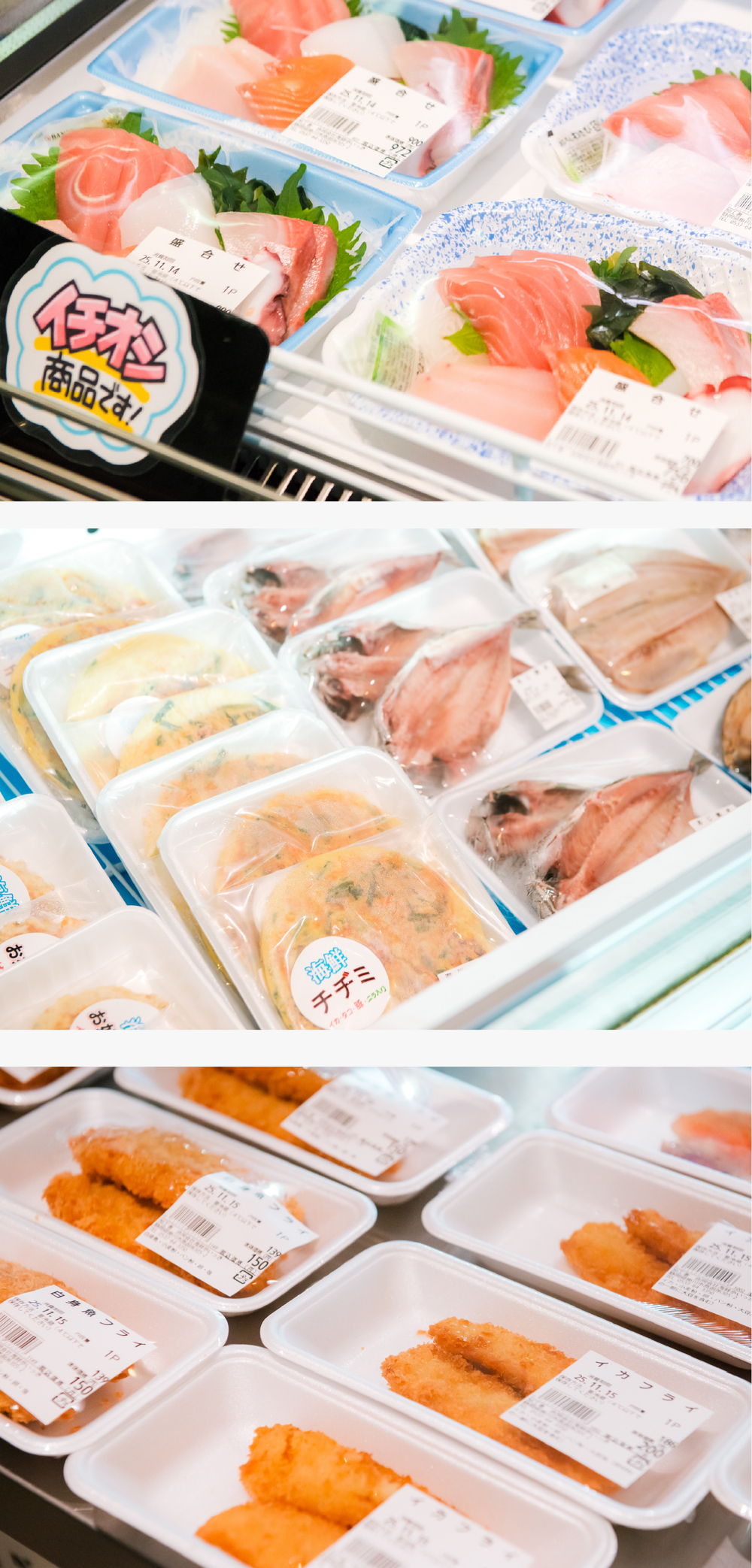 - 鮮魚市場のエリアには、地物や近海の魚がずらり。刺身はもちろん、干物や揚げ物、練り物・塩辛などの加工品などもあってバラエティ豊か。店内には「本日のお魚品書き」が書かれていますので、そこから刺身盛り合わせなどの別途注文も可能です。