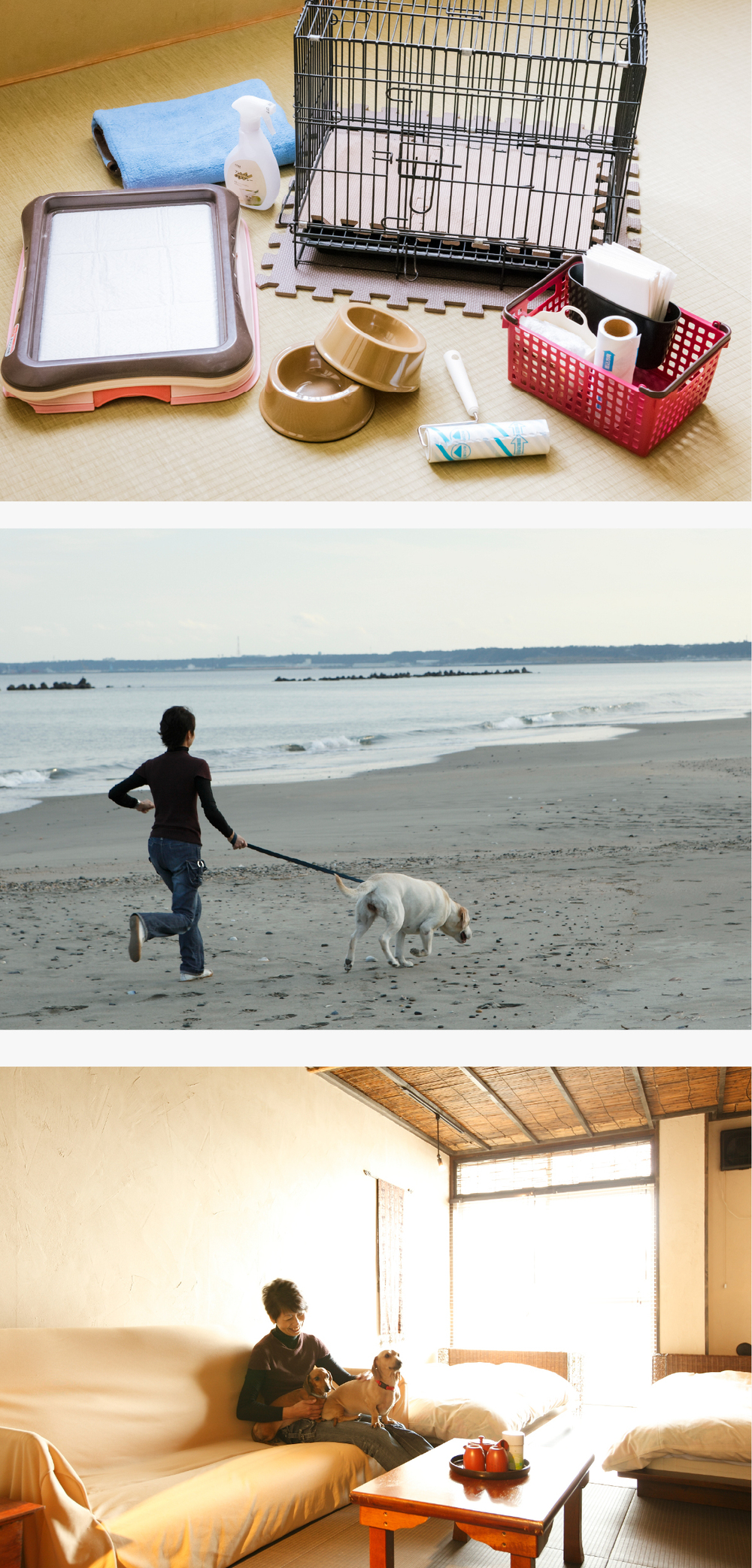 - 宿泊は素泊まりから食事付きまで、多様なプランがあります。料金は1泊2食付き1万2000円が目安。この料金に、小動物・ネコ・小型犬・中型犬はプラス1000円、大型犬はプラス3000円。滞在時のペット用トイレシートやケージといったアイテムの使用料が含まれており、良心的な価格で一緒に泊まれます。また、宿泊施設の屋上はドッグランとしても使用可能。ここなら砂浜で足が汚れる心配がないので、景色を眺めつつ、ペットとの時間を楽しめます。