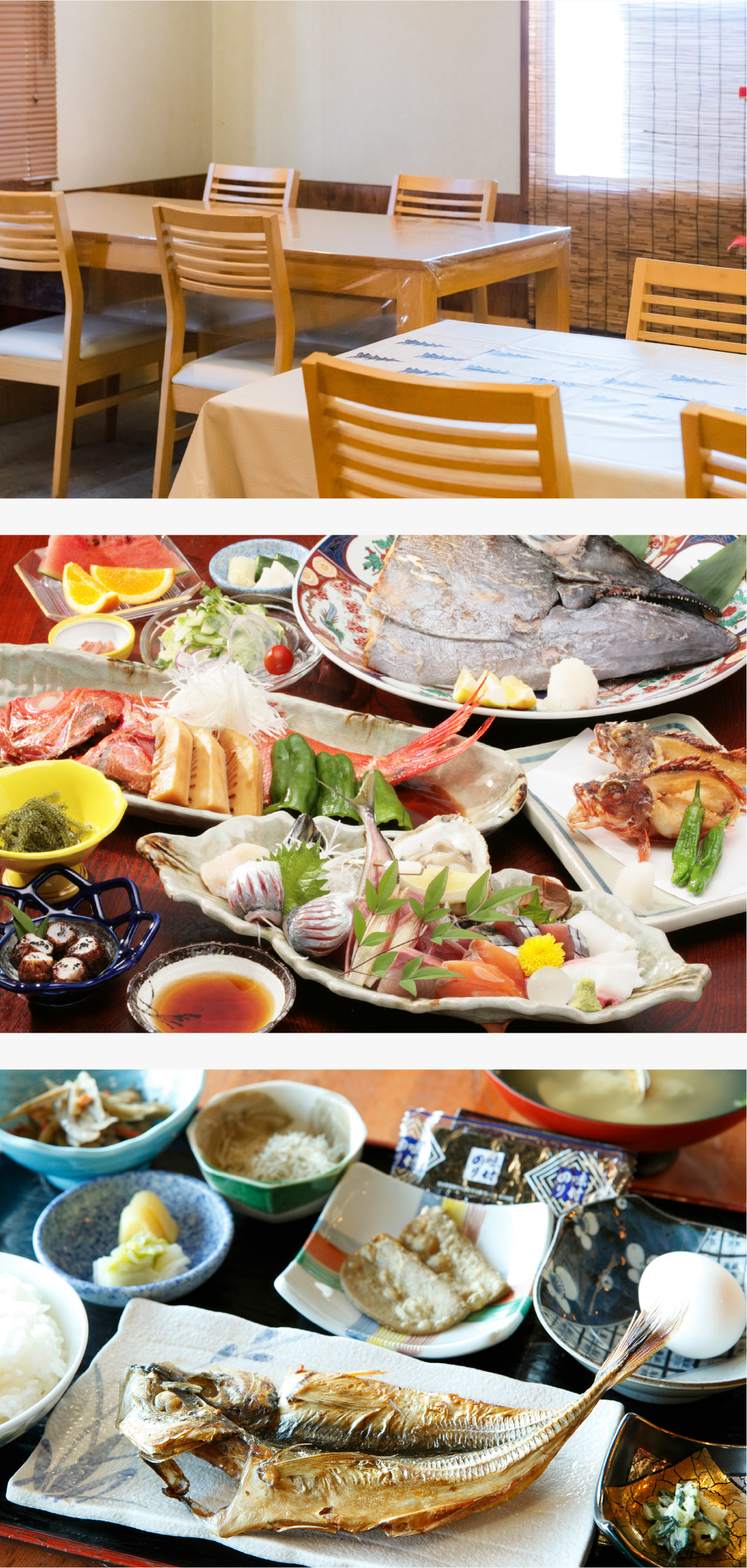 - 県外から訪れる観光客に人気なのが、食事付きのプラン。地元で獲れた魚などを中心に、静岡らしい料理や季節の一品が並びます。時季によっては、マグロのカマ焼きや金目鯛の姿煮といったインパクト大のひと皿が並ぶことも。朝は干物など、身体がよろこぶ和定食がメイン。ペットの食事は基本持ち込みですが、バースデープランとして、ささみや野菜などを煮込んだワンちゃん用の食事もオーダーできます。