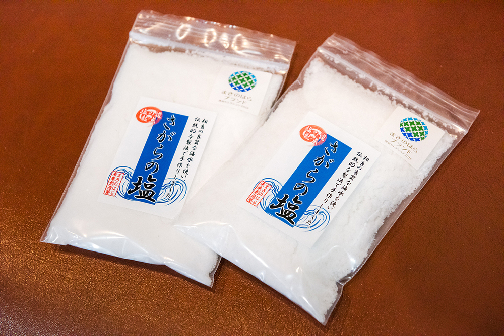 - おみやげには、オーナーが製造を手がけている「相良の塩」はいかが。相良の海水を汲み、伝統的な製法で仕上げています。牧之原市は塩や海産物を日本の内陸へ運んだ「塩の道」の起点とされている場所。歴史的にもゆかりのあるスポットの貴重な品です。