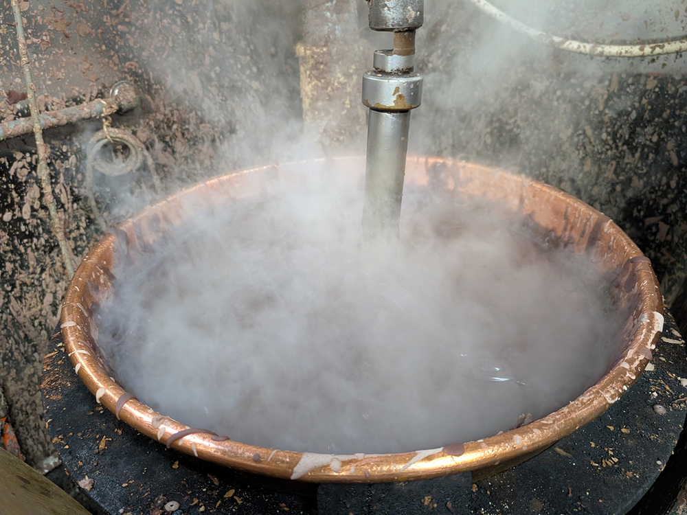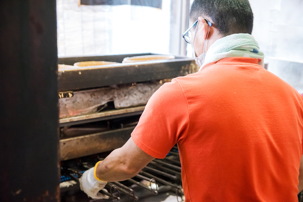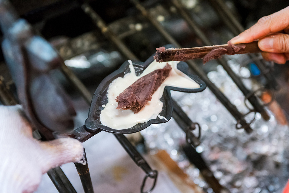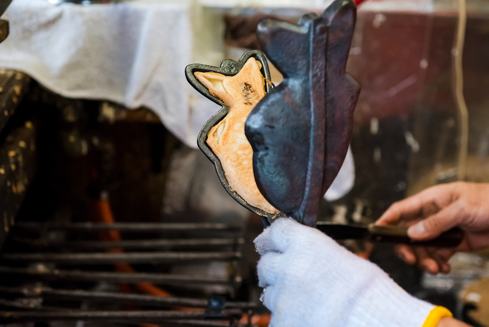 「鯛春」のたい焼きの最大の特徴は、創業当時から使用しているという鋳型で、1匹ずつ焼いていること。これを何度も何度もひっくり返し、ベストな焼き加減を見極めます。その頃合いは、“鋳型が教えてくれる”んだとか。1匹焼きにすることで、生地のおいしさや仕上がりにも違いが出るといい、巷では“天然のたい焼き”と評されています。 営業中、焼き場はサウナ状態で、冬でも半袖で十分だと充博さん。鋳型も2kgほどの重さがあり、つねに体力勝負。それでも、楽しみに並んで待つお客さんのため、できるだけ長く続けられれば、と話します。