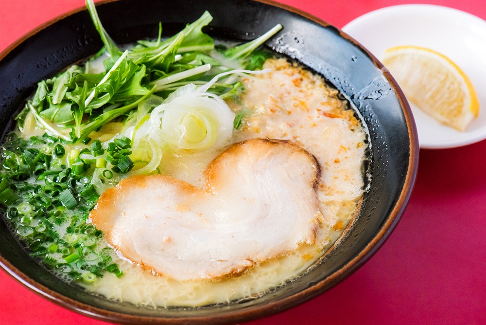 豚骨醤油に次いで人気だというのが、鶏を贅沢に使用したオリジナルベースの塩ラーメン。トッピングはチャーシュー・ネギ・水菜・オニオンチップ、そしてお好みでレモンを絞っていただきます。豚骨醤油に比べるとさっぱりした味わいですが、鶏の旨みがぎゅっと濃縮。途中、レモンを加えることで、ちょっと洋風に様変わり。最後まで飽きることなくいただけます。こちらは細麺・油少なめのオーダーが人気とのこと。