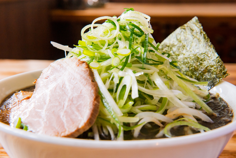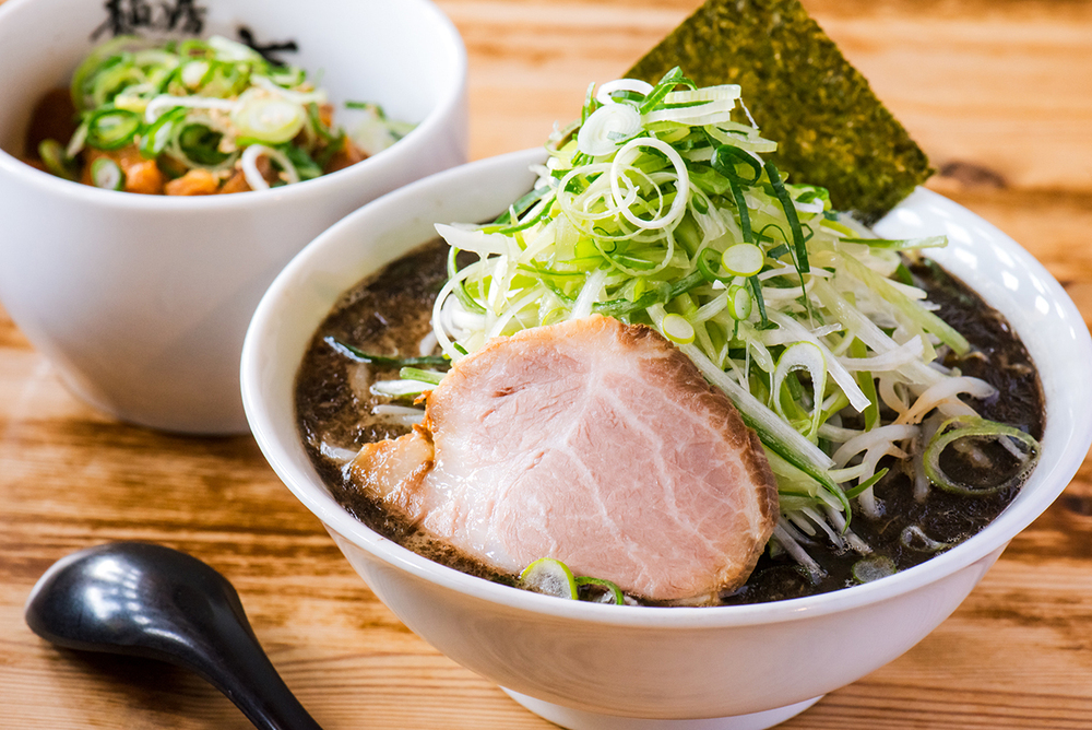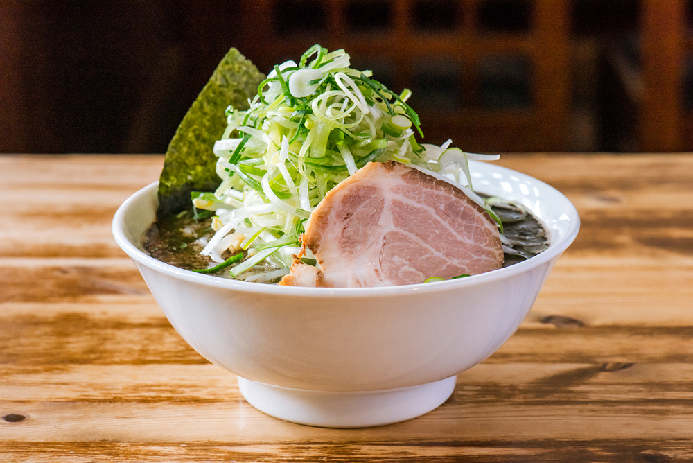 お店を代表する「ねぎらーめん」は、焦がしニンニクで仕上げる黒マー油がおいしさのポイント。香ばしい香りが豚骨のニオイを抑え、味にパンチと深みを与えます。その上にはまるでタワーのように盛られたたっぷりの太ネギ。夏・冬は御前崎の農家から直接仕入れているそうで、シャキシャキとした食感とネギ特有の辛みがさらなるアクセントに。一度味わったらやみつきになる味わいです。