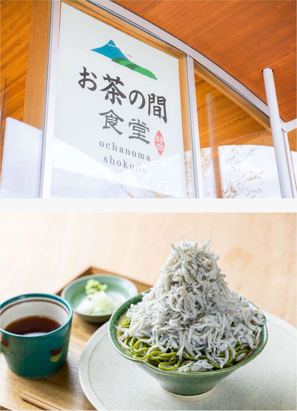 - 「お茶の間食堂」は、牧之原茶は静岡ならではのグルメが楽しめる食事処。こちらもオリジナリティあふれるグルメが満載です。特に話題なのが「牧之原茶そば しらすどっさりそば」。牧之原抹茶を練り込んだ風味豊かなそばの上には、しらすがどっさり。その量なんと200g。注文が入ると、目の前でしらすを載せるパフォーマンスもあり、訪れる人みんなが笑顔で食事を楽しみます。季節の食材を使った料理も増えるそうなので、今後の展開がますます楽しみですね。