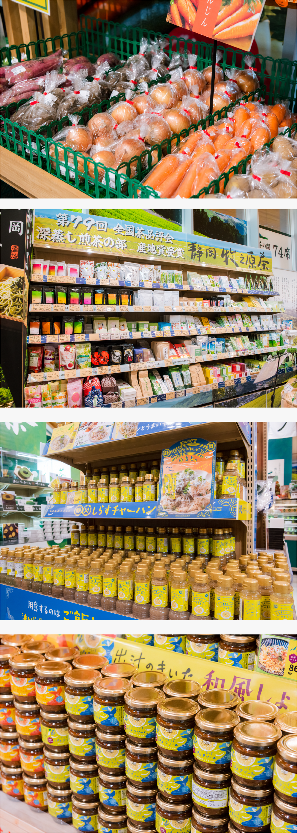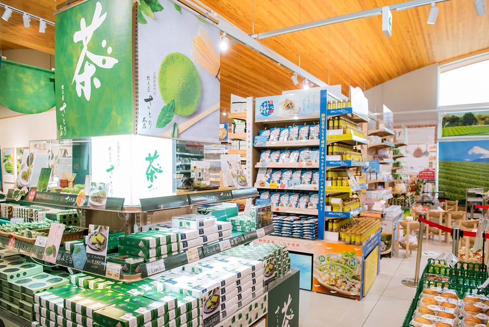 「道の駅そらっと牧之原」はお土産スペース、スイーツ「牧之原さとり本店」、食事処「お茶の間食堂」と、大きく分けて3つのカテゴリで構成されています。お土産スペースには、道の駅らしく地物野菜やフルーツが売られている他、牧之原産のお茶・抹茶や、しらすをはじめ静岡名産を使ったボトルグルメがずらり。