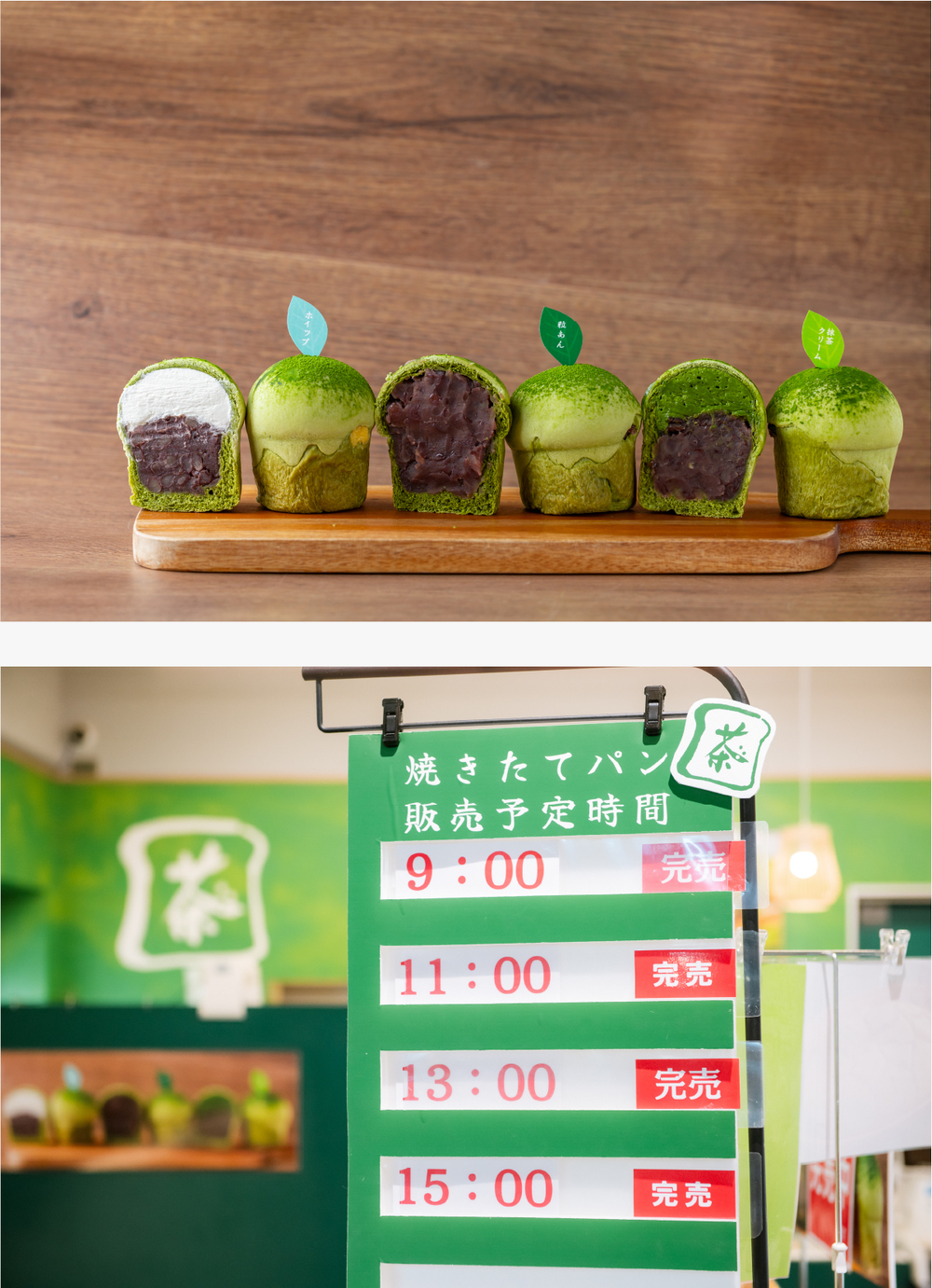 「牧之原さとり本店」の一角には、ベーカリー専門店「さとりベーカリー」があり、こちらも連日大行列。自家製クリームとあんこを、静岡県産の小麦粉・米粉の生地で包んで焼き上げた「お濃茶クリームあんぱん」は、中だけでなく生地にも抹茶パウダーをふんだんに練り込んであり、抹茶好きにはたまりません。他にも「お濃茶クリーム生ドーナツ」「お濃茶メロンパン」「お濃茶食パン」とお茶づくし。 抹茶スイーツや焼き立てパンを目当てに多くの人で混雑しますので、事前にインスタグラムの情報をチェックするのがおすすめです。