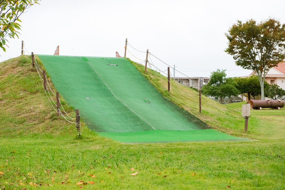 - この「おさ川ふれあい公園」の大きな特徴は、運動やスポーツなど、健康に特化しているということ。もともとこの公園は、“近くに公園がほしい”という住民の声から生まれたそうですが、その際、健康のための公園とテーマが設けられ、随所にそのコンセプトが現れています。 公園ではめずらしくバスケットボールのゴールが設置されていたり、人工芝の大きな滑り台が設けられていたり、他とはちょっと違った楽しみ方ができます。ちなみにボールや滑り台用の段ボールは、管理棟にいけば無料で貸し出してくれます。どれも忘れものなどを活用しているそうなので、丁寧に使うようにしましょう。