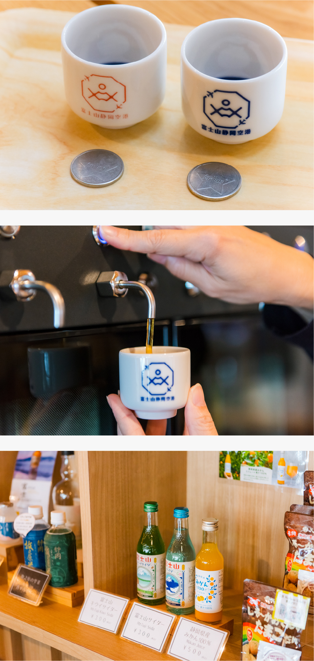- 試飲の種類は主に2種。「Aコース(900円)」は試飲2杯とフード1品、「Bコース(500円)」は試飲2杯が試せます。試飲の量は高級茶・日本酒で1杯40ml、ウイスキーは1杯10ml。コインが2枚渡されますので、試したいボトルのマシンにコインを投入し、試飲ボタンを押しましょう。お子さんやお酒の苦手な方には、ジュースやサイダーなどの試飲もあります。