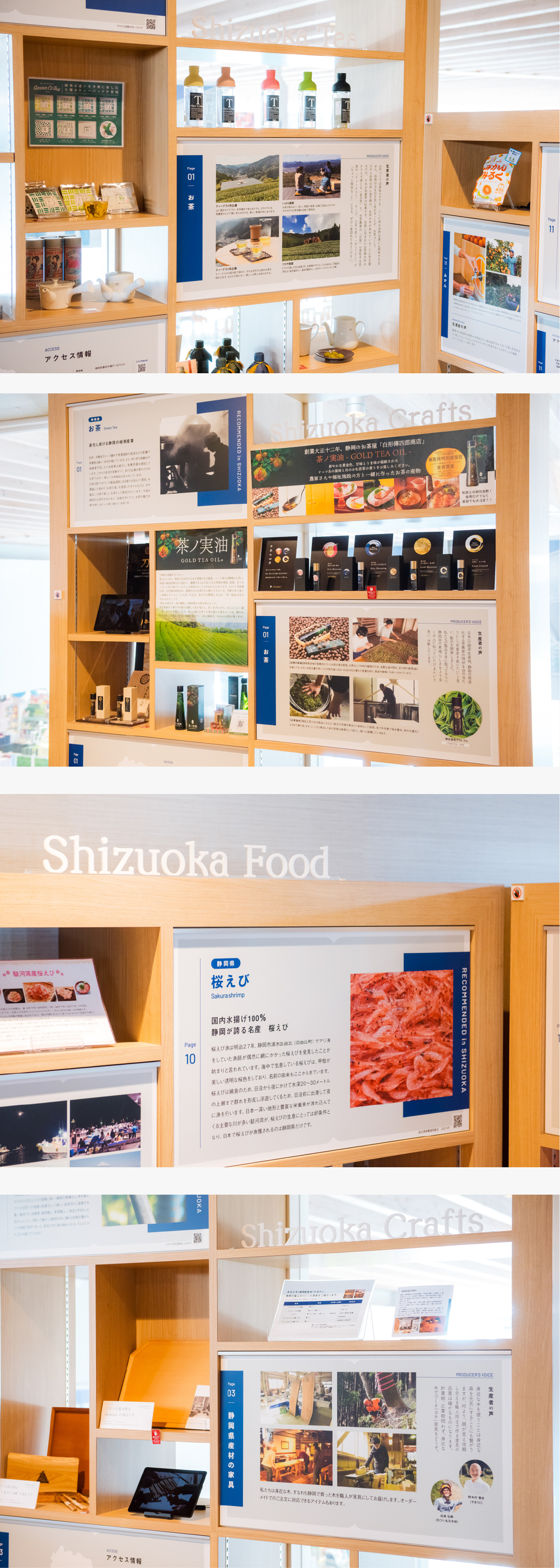 展示ゾーンのコンセプトは、“本のページをめくるように”。あちらこちらに散りばめられた魅力的な展示を、自分のペースでゆっくり鑑賞することができます。展示内容は文字情報だけではなく、写真や映像、実物などを織り交ぜており、見ているだけでワクワク。また、「静岡茶」というテーマひとつをとっても、飲むお茶だけではなく、お茶を使ったオイルや染め物、観光地など、多面的に紹介。訪れた方からは「静岡生まれだけどこれは知らなかった」といった感想が多く寄せられているんだとか。常時10点ほどのテーマが展示されており、テーマや展示物は半年に1回ほど新しくなるそうです。