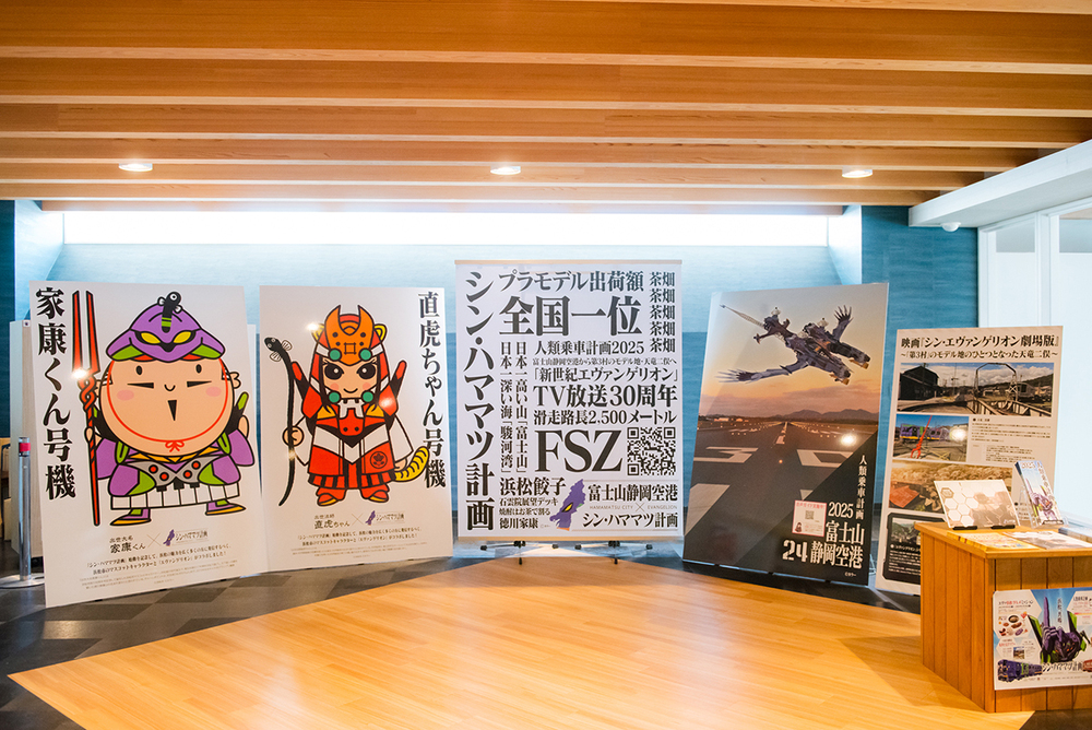- ショールーム内では2026年2月28日(土)まで、「エヴァンゲリオン」と浜松市がコラボした「シン・ハママツ計画」の展示を実施しています。パネルや模型といったスペシャルな展示の他、対象のセットの有料試飲で、エヴァンゲリオンの富士山静岡空港限定ステッカーをプレゼント中。詳しくはHP(空のしおりページ)をご覧ください。