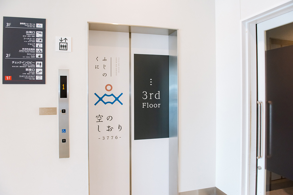 「空のしおり」へは、富士山静岡空港の入口向かって左手、コンビニ側のエレベーターで3階へ向かいます。右手の国際線側エレベーターからは行けないのでご注意を。2階の国内線保安検査場を見下ろす位置にあるので、フライトまでの時間を有意義に活用するにはぴったり。