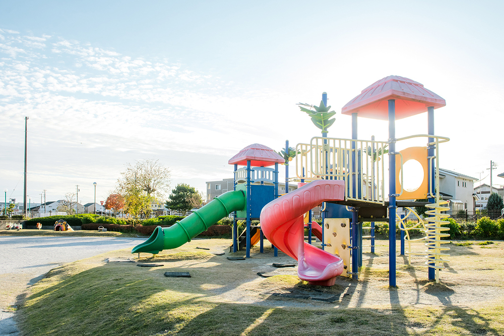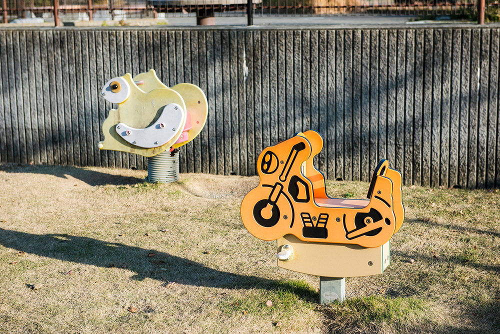- また、カラフルな遊具も特徴的。ちょっと大きなお子さんのためのダイナミックな複合遊具から、小さなお子さんでも楽しめるスプリング遊具や、かくれんぼにぴったりな、ライオンがモチーフの遊具も。どの年齢でも気兼ねなく楽しめるのがうれしいですね。もちろん、大人のためのベンチやトイレも完備しています。